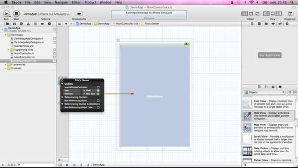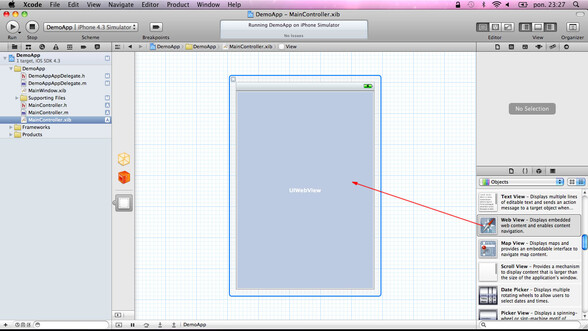 In the right pane, find the “UIWebView” control in the “Object” library and drag it into the view.