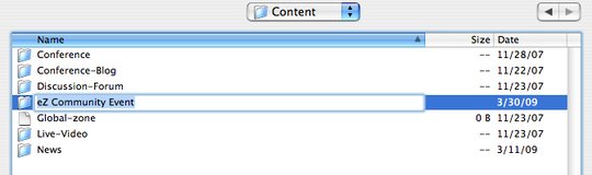 Note that when you create a folder with spaces (or other "special" characters in the name), the file names you see in the DAV client basically are the url aliases. This means these names will be converted by the same rules as other url transformation. So if you create a folder named "eZ Community Event" it might show up as that in your client (varies with different clients), however if you refresh, it will be shown as "eZ-Community-Event", and this is the correct name, to be used.