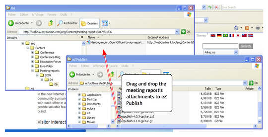 Note that the “Open as Web Folder” checkbox must be checked, and that we appended a “#” at the end of the domain name. This is required for Internet Explorer to work properly as WebDAV client. So once you see you content repository in Explorer, you take a simple drag and drop of the files you wanted to attach to the meeting report, as follows (high definition image) :