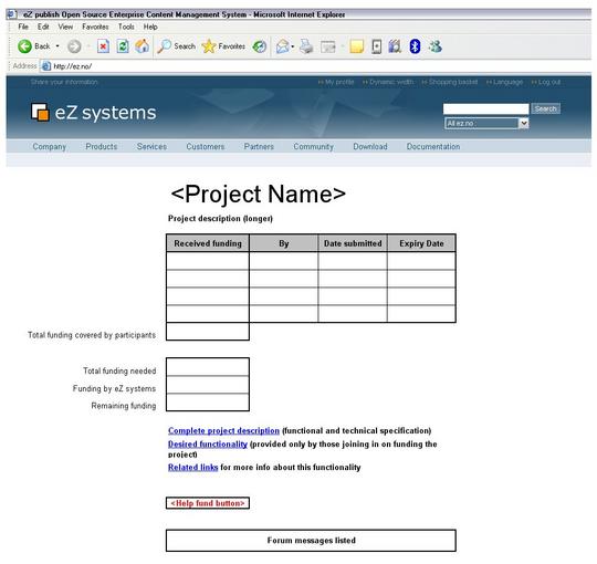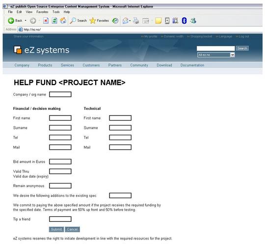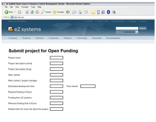When you submit a project to the eZ Open Funding program, an eZ employee will typically be chosen as the main contact and project manager. This member of the eZ crew will handle all technical queries and forum posts related to the project. The submission form will look something like this: