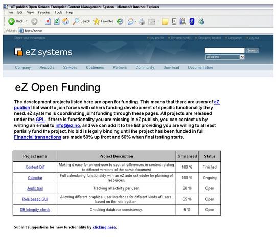 Communities typically openly discuss requirements, with these discussions serving as a catalyst for producing the best solution for the largest segment of the community. Enterprises are typically driven by capital, allowing greater speed of development and implementation. eZ Open Funding combines both, resulting in enterprise-quality Open Source software.