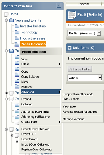 This screenshot shows the pop-up menu in the Content structure tab. The title at the top of the menu is the name of the node or object that was clicked. In the example above, a node called "Press Releases" was clicked.