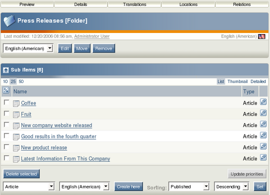 The secondary menu provides access to content and interfaces that are associated with the tab that was selected from the main menu. If your browser has JavaScript support enabled, the secondary menu of the first three tabs is shown as an interactive tree. The main area displays the actual content and interfaces that are associated with the selected node. This is where most of the work is done. When viewing content here, you will see a row of switches at the top that are used for toggling information windows on and off. If all switches are turned on at the same time, the windows will appear in the same order as the placement of the switches (left to right): Preview, Details, Translations (multilingual sites only), Locations and Relations. The Sub items window is always at the bottom.