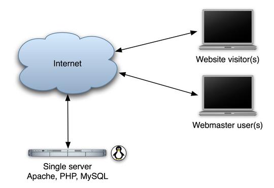 This section describes the architecture for Exponential running on one webserver and one database server. This is a similar configuration as that used for clustering, except a clustered environment has more webservers.