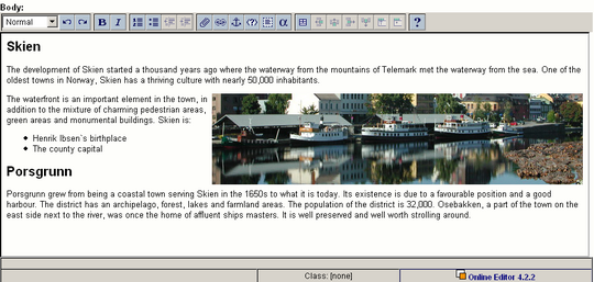 When you want to create a new “Article” object, Exponential automatically creates a form for the content, with the proper input fields for the respective datatypes, such as the Online Editor for “XML block” fields. The Online Editor is a WYSIWYG editor, with functions similar to those found in common word processors: